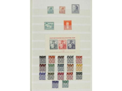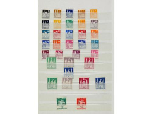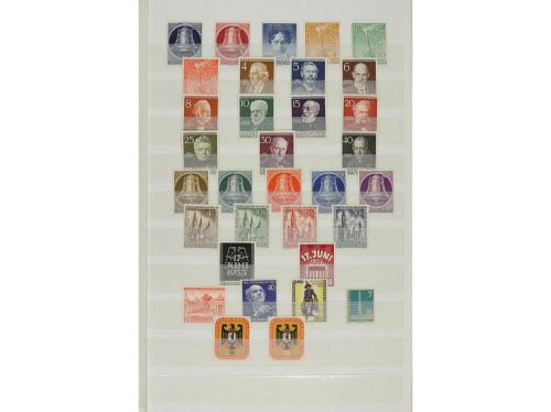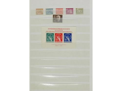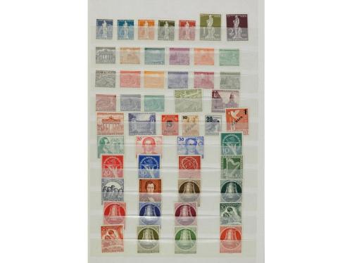 LOTES y COLECCIONES. ALEMANIA, BIZONA y BERLÍN. Colección en clasificador entre los años 1945 y 1990 formado por series nuevas y completas sin señal de fijasellos y de buena calidad. Están todas las series y hojitas de valor (algunas con goma no original). Incluye Berlín Yv. 1/20 con sobrecargas negra y roja también en usado (mat. póstumo). Alto valor en catálogo. Foto en web (6).