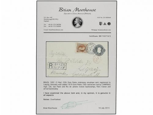 BRASIL. Sc. 76. 1891. CAMPINAS a ALEMANIA. Entero postal de 200 reis negro con franqueo adicional de 700 reis castaño rojo. Carta certificada, llegada en anverso. Precioso y muy raro franqueo. Cert. B. MOORHOUSE.