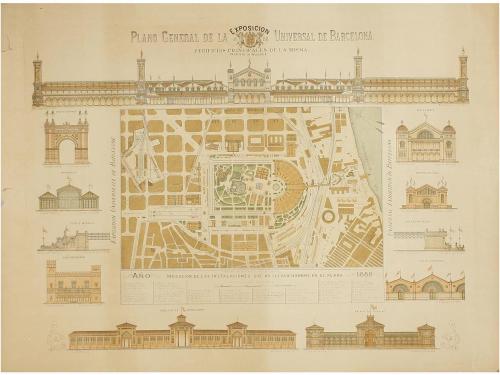 1888. CARTEL. (EXPOSICIÓN Y FERIAS). 2 CARTELES DE LA EXPOSICIÓN UNIVERSAL DE BARCELONA 1888. 2 Cromolitografías. Planimetrías y alzados de algunos edificios de la Ciudadela. 49 x 63,5 cm (19 x 25 in). Anónimo. Cortes periféricos y señales de óxido. B-. [Más:] PLANO GENERAL DE LA EXPOSICIÓN UNIVERSAL DE BARCELONA. 64 x 85 cm (25 x 33 in). Bordes erosionados con alguna rasgadura; B. Anónimos.