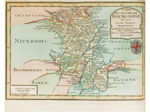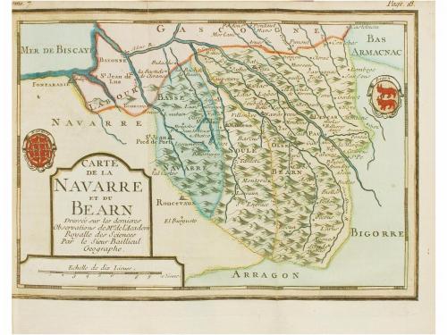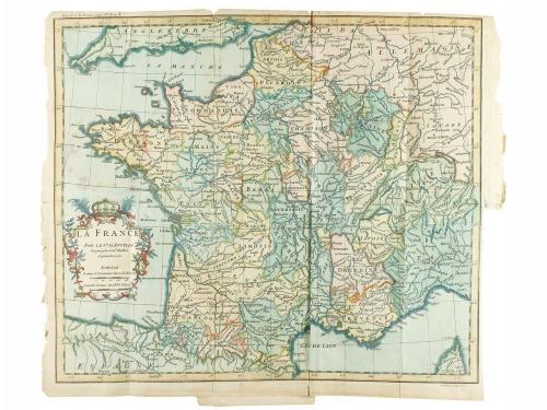 1952-1954. LIBRO. (FRANCIA-GEOGRAFÍA). PICANIOL DE LA FORCE, JEAN AIMAR:. INTRODUCTION A LA DESCRIPTION DE LA FRANCE, ET AU DROIT PUBLIC DE CE ROYAME. Paris: Chez Theodore Legras, 1752-1754. 13 vol. en 8º. I: 2 h. + 466 p. y 1 mapa plegado. II: 2 h. + 528 p. y 3 mapas plegados. III: 2 h. + 574 p. y 3 mapas plegados. IV: 2 h. + 424 p. y un mapa plegado. V: 2 h. + 484 p. y dos mapas plegados. VI: 2 h. + 470 p. y un mapa plegado. VII: 2 h. + 463 p. y 9 mapas plegados. VIII: 2 h. + 450 p. + 1 h. y 5 mapas plegados. IX: 2 h. + 655 p. y 3 mapas plegados. X: 2 h. + 478 p. + 1 h. y 4 mapas plegados. XI: 2 h. + 571 p. y 5 mapas plegados. XII: 2 h. + 566 p. + 2 h. y 9 mapas plegados. XIII: 2 h. + 648 p. y 9 mapas plegados. Todos los mapas de la obra han sido coloreados. Se incluye el primer cuadernillo de "Introduction a la description de la France", con el mapa plegado. Trece vol. con la encuadernación muy deteriorada, varios vol. con cajos sesgados, la mayoría de los vol. han sido fijados con material poco adecuado para restauración, preferible examinar. Marcas de caucho y exlibris de anteriores poseedores. Obra monumental que aparece por primera vez en 13 vol., y es trabajo concienzudo, metódico y sistemático. Se convirtió en un clásico casi inmediatamente y fue objeto de numerosas reediciones, también plagios.