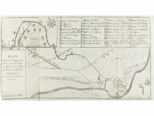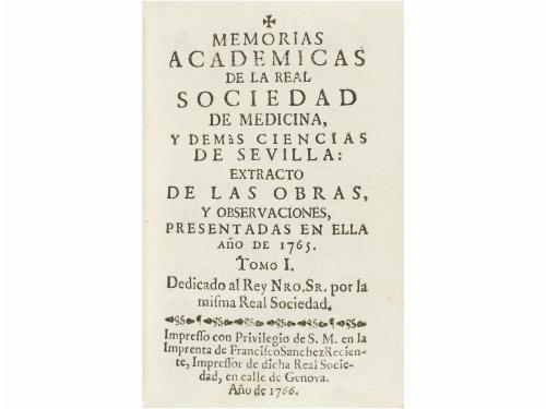 1766. LIBRO. (CIENCIAS-MEDICINA). BUENDÍA Y PONZE, FRANCISCO DE; PÉREZ BRIOSO, PEDRO; CORREA ANTONIO JOSEPH... MEMORIAS ACADEMICAS DE LA REAL SOCEDAD DE MEDICINA, Y DEMÁS CIENCIAS DE SEVILLA: Extracto de las obras y observaciones, presentadas en ella. Año 1735. Tomo I. Sevilla: Imp. Francisco Sanchez Reciente, 1766. 8º mayor. Frontis + 28 h. + 649 p. + 3 h. Ilustr. con cabeceras, culs-de-lampe xilografiadas y 3 planos plegados, grabados por Roman de los cursos de aguas que pasan por Sevilla como el Guadalquivir para ilustrar el artículo: "Sobre el origen y calidad de las aguas potables de Sevilla. Tenue cerco de humedad marginal en las últimas 7 h. aunque en general páginas limpias. Enc. en pasta española rozada con alguna restauración, cortes pintados, lomera cuajada, tejuelo. CCPB 347767-3. [Más:] PIQUERII, ANDREAE: PRAXIS MEDICA. Ad usum Scholae Valentinae. Pars prior et Pars posterior. Amsterdam: Sumptibus Societatis, 1775. 2 tomos en 1 vol. en 8º mayor. IV p. + 268 p. + IV + 315 p. Portada con grabado tipográfico. Cabeceras y culs-de-lampe xilografiadas. Enc. en pasta española con mínimas rozaduras, lomera cuajada, nervios, tejuelo y cortes pintados.