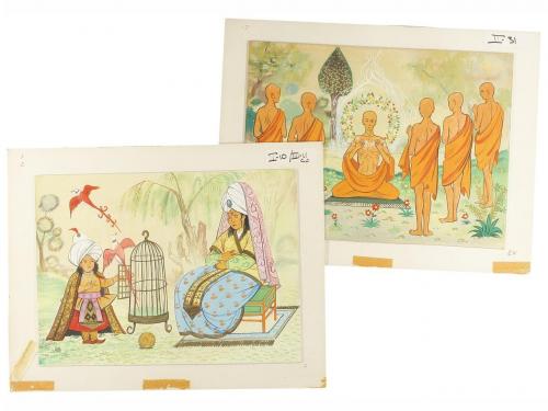 1980 ca. ORIGINAL ARTÍSTICO. (HISTORIA-INFANTIL). LOTE DE 76 DIBUJOS ORIGINALES PARA ILUSTRAR HOMBRES EN LA HISTORIA. Contiene: 12 lám. de LUIS XIV en técnica mixta sobre cartulina de 21 x 28 cm aprox.; 15 lám. de LOS REYES CATÓLICOS en acuarela sobre cartulina con una lám. de acetato sobrepuesta con texto impreso al pie de 21 x 28 aprox.; 15 lám. de CRISTOBAL COLÓN y 34 de BUDA en técnica mixta sobre cartulina de 21 x 28 cm aprox. Dibujos originales para publicar en obras divulgativas.