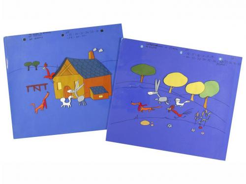 1980-1990 ca. ORIGINAL ARTÍSTICO. (CUENTOS-INFANTIL). LOTE 142 DIBUJOS ORIGINALES PARA CUENTOS INFANTILES. Conjunto que contiene dibujos de: LOS MÚSICOS DE BREMEN, 42 lám. de acetato y 3 cartulinas; CUENTOS DE CANTERBURY, 37 lám.; EL PARAISO PERDIDO, 35 lám. y LA SANTA INFANCIA, 25 lám.; varios tamaños, 25 x 30 cm aprox. sobre cartulina en técnica mixta, la mayoría combinadas con hojas de acetato ilustradas.