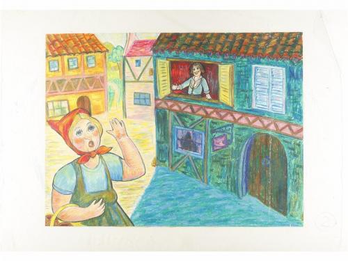1990 ca. ORIGINAL ARTÍSTICO. (CUENTOS-INFANTIL). LOTE DE 89 DIBUJOS ORIGINALES PARA CUENTOS INFANTILES. Contiene: LAS TRES HILANDERAS, 45 dibujos en acuarela sobre acetato de 25 x 35 cm. aprox. EL SASTRECILLO VALIENTE, 44 ilustraciones a la cera en papel 28 x 37 cm, sobre cartulina de 35 x 50 cm.
