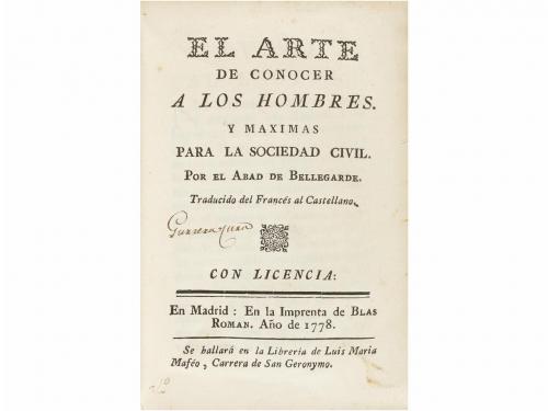1778. LIBRO. (CONJUNTO-HUMANIDADES). EL ARTE DE CONOCER A LOS HOMBRES y maximas para la Sociedad civil por... Madrid: Imp. de Blas Roman, 1778. 8º menor. 7 h. + 334 p. 1 hoja rasgada sin pérdida, falta S2. [Más:] RETRATO DEL HOMBRE DE HONOR... Id: Oficina Gerónimo Ortega e hijos de Ibarra, 1791. Id 2 h. + 215 p. Algún punto de óxido. 2 vol. enc. en pergamino de época, lomeras rotuladas; una de ellas semidescosida.