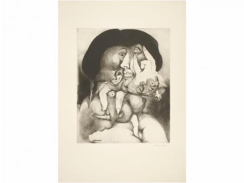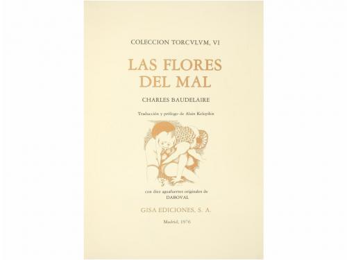 1976. LIBRO. (BIBLIOFILIA). BAUDELAIRE, CHARLES:. LAS FLORES DEL MAL. Traducción y Prólogo de Alain Kelepikis. Madrid: Gisa Ediciones, 1976. Gran folio. 36 p. + 10 aguafuertes de Daboval firmados en plancha y a lápiz y estampados por Pierre Gauthier, viñetas decoradas por el mismo artista. Edición dirigida por Celedonio Perellón. En rama, presentado en carpeta de rústica. Edición de solo 151 ejemplares, este marcado 000A, no descrito en la justificación.