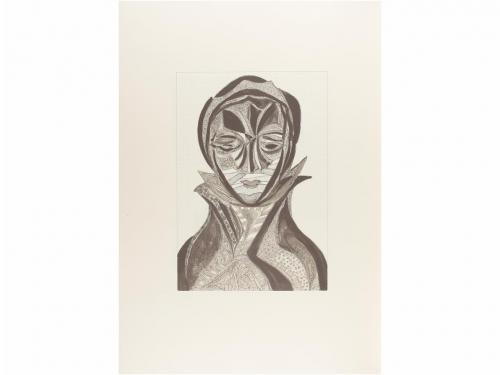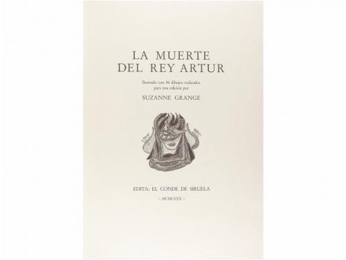 1980. LIBRO. (BIBLIOFILIA). GRANGE, SUZANNE:. LA MUERTE DEL REY ARTURO. Madrid: Eds. Conde de Siruela, 1980. Gran folio. 163 p. + 8 h. Texto a dos columnas. Ilustr. con 56 dibujos de Suzanne GRANGE. Enc. en tercipelo negro, con estuche en cartoné, ligeramente rozado. Edición numerada de 515 ejemplares, del tiraje de 483. Última parte del llamado ciclo Vulgata del siglo XIII.