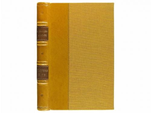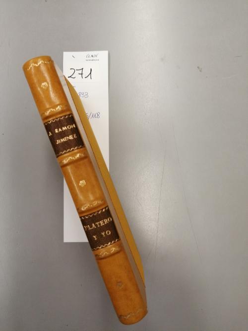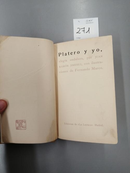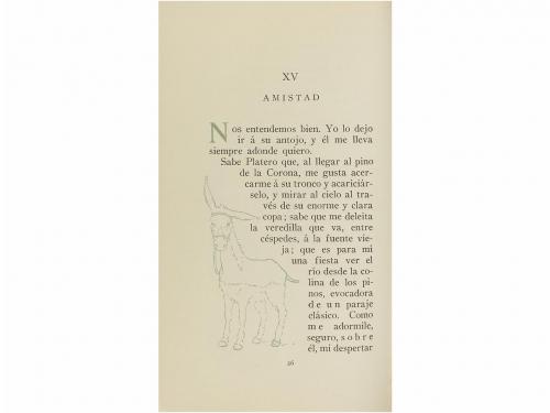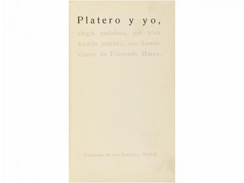 1914. LIBRO. (LITERATURA-MODERNISMO). JIMÉNEZ, JUAN RAMÓN:. PLATERO Y YO, elegía andaluza, por..., con ilustraciones de Fernando Marco. Madrid: Ed. La Lectura, 1914. 8º menor. 141 p. + 1 h. Ilustr. con grabados y viñetas en el texto. Bellísima enc. en media piel, nervios y dos tejuelos, guardas con papel al agua. Obra capital de la literatura modernista y referente en la literatura contemporánea de riquísimo vocabulario. Juan Ramón Jiménez utiliza sus planos de juventud para escenificar una fábula en clave de crítica social. PRIMERA EDICIÓN, muy rara y buscada. Palau 124402.