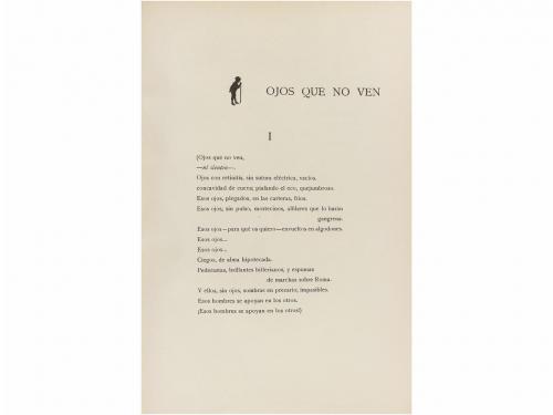 1937. LIBRO. (LITERATURA-GENERACIÓN 36). POZANCO, ANGEL MIGUEL:. OJOS QUE NO VEN a Maria Teresa Leon y Rafael Alberti. "El importe de esta edición dedicada a beneficio del Socorro Rojo". Valencia: Ediciones Actualidad, 1937. 4º menor. 12 h. Conjunto de 12 poemas. Pozanco fue uno de los poetas más silenciados y perseguidos por el franquismo, autor célebre por dar a conocer la convulsa situación de Guinea Ecuatorial durante la Guerra civil. PRIMERA EDICIÓN. Enc. en media piel y papel pintado al agua, hilo dorado en ambos planos, nervios. Ejemplar muy raro y en buen estado. Conserva las cubiertas originales.