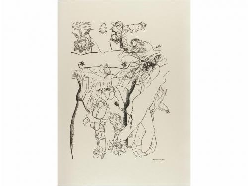 1950. LIBRO. (LITERATURA-GENERACIÓN 27). ALEIXANDRE, VICENTE:. MUNDO A SOLAS 1934-1936. Con un retrato y seis dibujos por Gregorio Prieto. Madrid: Clan, 1950. Folio. 98 p. + 3 h. Portada a dos tintas. Ilustr. con un retrato y 6 lám. litografiadas en el texto. Cubierta anterior con pequeñas restauraciones en el margen interior y alguna señal de óxido. Enc. en media piel y puntas con papel al agua, lomera con dorados y nervios. Conserva las cubiertas originales. PRIMERA EDICIÓN. Tiraje de 200 en papel de hilo guarro, ejemplar núm. 148.