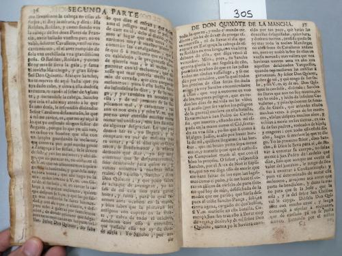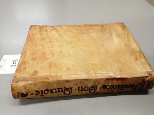 1732. LIBRO. (CERVANTINA). FERNÁNDEZ DE AVELLANEDA, ALONSO:. VIDA, Y HECHOS DEL INGENIOSO HIDALGO DON QUIXOTE DE LA MANCHA, QUE CONTIENE SU QUARTA SALIDA, Y ES LA QUINTA PARTE DE SUS AVENTURAS. Madrid: Juan Oliveras, 1732. 8º mayor. 16 h. + 275 p. +2 h. La última página numerada 475 por error. Grabado en la portada. Cabeceras y culs-de-lampe xilografiadas. Algo corto de márgenes. Enc. en pergamino, lomera rotulada. Palau 88034 dice de esta edición que es tan rara como la primera y lamenta que la ignorancia de algunos ha mutilado muchos ejemplares, pues la portada reza "Parte II. Tomo III". Es obra completa, Cervantes no publicó la verdadera segunda parte de las aventuras del Quijote hasta 1615 y el de Fernández de Avellaneda había salido de la impenta el año anterior. No se sabe a quién esconde este pseudónimo aunque hay muchas teorías. Algunos estudiosos apuntan a Cristóbal Suárez de Figueroa, por sus disputas con Cervantes y el estilo.