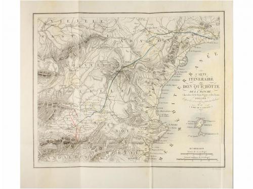 1822. LIBRO. (CERVANTINA). CERVANTES SAAVEDRA, MIGUEL DE:. LE DON QUICHOTTE. Trad. Bouchon Dubournial. París: Méquignon-Marvis Libr. Edit., 1822. 4 vol. en 4º menor. I: XLI + 461 p. II: 2 h. + 529 p. III: 2 h. + 570 p. IV: 2 h. + 598 p. Ilustr. con 11 lám. grabadas por Lignon, Prevost, Leroux, Caron y Burdet de dibujos de Vernet y Lamic y 1 mapa plegado: ´Carte itineraire de Don Quixotte de la Manche´ dressée par Bory de St. Vicent. Algún punto de óxido. Cuatro vol. enc. en media piel, lomeras con dorados, ligeramente rozada. Palau 52778.