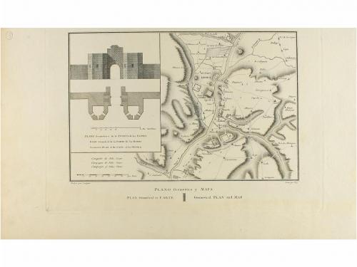 1800 ca. MAPA. (LLEIDA). MOULINIER y VICQ:. PLANO DE LERIDA. Sobre un dibujo de Moulinier el grabado está realizado ro Vicq, firmado en plancha. 42 x 59,5 cm, alguna rasgadura marginal. [Más:] LARGIGUE y VICQ: PLANO GEOMETRICO DE LA PUERTA DE LOS BOTES Y MAPA; CAMPAÑA DE JULIO CÉSAR. Dibujado por Lartigue y grabado por Vicq. 22 x 32 cm huella y 25 x 41,5 cm papel. Ligero cerco de humedad en la parte inferior.