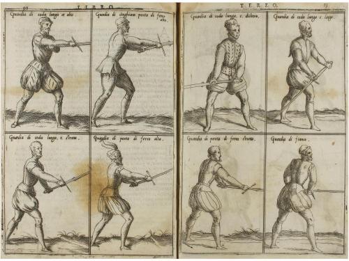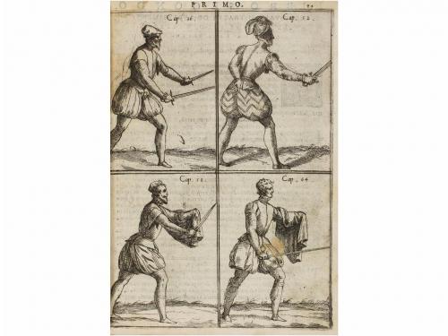 1568. LIBRO. (ARTE DE LA GUERRA). MAROZZO, ACHILLE:. ARTE DELL'ARMI. Venetia: Appresso Antonio Pinargenti, 1568. 8º mayor. 6 h. + 194 p. (error de paginación pero texto completo). Además de la portada con magnífico grabado arquitectónico, lleva 26 planchas grabadas al cobre en el texto. Al final de la obra se observa una marca de óxido en el margen superior. Enc en pasta española, tejuelo, cortes pintados, probablemente en el s. XIX. Antiguo exlibris. A pesar de ser la cuarta edición el texto sigue siendo fiel al de la edición de 1536. Marozzo en este tratado se fundamenta en los principios de la escuela de Bolonia. Fue el primero en escribir sobre esgrima con principios suficientemente definidos y prácticos de manera que puede ser considerado el verdadero fundador de la esgrima italiana. Analiza diversas formas de combate con armas blancas, espada, daga, broquel y técnicas de autodefensa. Aún hoy es un tratado de referencia para los amantes de la antigua esgrima.
