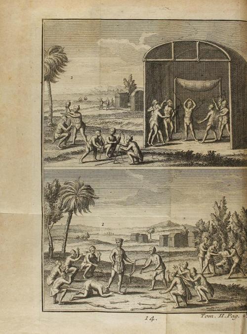 1724. LIBRO. (ETNOLOGÍA-VIAJES). LAFITAU, JOSEPH FRANÇOIS:. MOEURS DES SAUVAGE AMERIQUAINS. COMPARE'ES AUX MOEURS DES PREMIERS TEMPS. TOME SECOND. Paris: Chez Saugrain l'ainé et Hochereau, 1724. Un vol. en 8º menor. 4 h. + 296 p. + 6 lám. plegadas. Ilustr. con cabeceras, capitales y lám. calcográficas, dos de ellas con una pequeña rasgadura. Páginas ligeramente tostadas. Obra pionera en etnografía científica, escrita por el jesuita francés Lafiteau. Anotaciones manuscritas de anterior poseedor. Enc. en pasta española ligeramente rozada, lomera cuajada, doble tejuelo, cortes pintados. BNF 33995317. CCPB 317667-3.