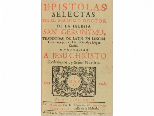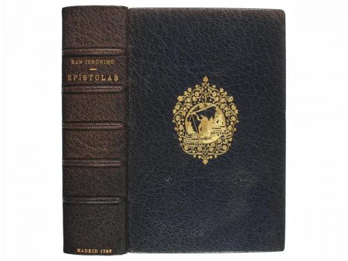 1748. LIBRO. (HUMANIDADES). GERONYMO:. EPISTOLAS SELECTAS DE EL MAXIMO DOCTOR DE LA GILESIA SAN GERONYMO, TRADUCIDAS DE LATIN EN LENGUA CASTELLANA. Trad. Francisco Lopez Cuesta. Madrid: Imp. Antonio Perez de Soto, 1748. 8º menor. 8 h. + 546 p. Enc. por BRUGALLA en plena piel, nervios, superlibris en ambos planos, cortes dorados, cantos y cejas. Exlibris de piel en la guarda interior. Rara y antigua edición de las "Epistolas" de San Jerónimo, no descrita por Palau. Muy leída durante los siglos XVII y XVIII, como contrapunto a los libros de caballerías.
