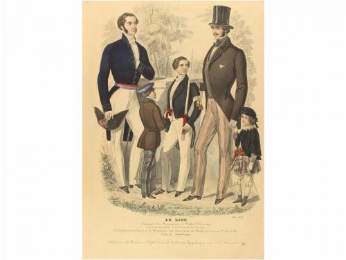 1852-1856. LIBRO. (MODA-GRABADOS). L'ELÉGANT. JOURNAL DES TAILLEURS.- LE LION. JOURNAL DES NOUVEAUTÉS ET DES MODES D'HOMES. [París]: Imp. Mariton, 1852-1856. 4º mayor. 99 láminas grabadas en metal e iluminadas a mano en colores vivos y con precioso detalle (14 de ellas a doble página), montadas en un volumen de época. Enc. de época en media piel y cartoné pintado al agua, puntas restauradas, hierros dorados en el lomo con el título inscrito: "La Moda". Cortes marbelados. Ligeras manchas de tinta de la propia iluminación a mano. Muy buen estado de conservación. Edición original de estas preciosas láminas iluminadas a mano y recopiladas en un volumen facticio, aparecidas en las revistas de: L'Élégant y Le Lion, entre los años 1852 al 1856. Gran repertorio de trajes y uniformes para el hombre; desde sombreros de todo tipo, chaquetones, pantalones, a uniformes. Normalmente las láminas contienen de tres a cinco personajes (hombres y niños) por página, las últimas catorce láminas son a doble página y con más de diez personajes con sus respectivos trajes, indicando los respectivos diseñadores en la parte inferior, y los lugares donde poder comprar los complementos. Raro conjunto de láminas de moda masculina muy poco frecuente en el mercado. Bibliography of Costume p.696, solo una escueta referencia para Le Lion. Se conoce un ejemplar de la revista en la Biblioteca Nacional de Francia.