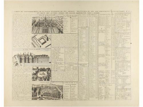 1720 ca. GRABADO. (GOBIERNO MILITAR). [CHATELAIN, HENRY ABRAHAM:]. CARTE DU GOUVERNEMENT DE LA COUR D'ESPAGNE DE SES ORDRES MILITAIRES DE SON GOUVERNEMENT ECLESIASTIQUE. ET CELUY DES AUTRES ETATS DE CETTE MONARCHIE DANS L'EUROPE. Nº 36. Extraído del "Atlas Historique" publicado en Amsterdam entre 1705 y 1720. Todo el texto en plancha, dos hojas unidas por el centro, 34 x 44,5 cm huella y 40 x 51 cm papel. Lleva cinco grabados de El Escorial, El palacio del arzobispo, el palacio real de Madrid, la casa real en Aranjuez y la plaza Mayor.