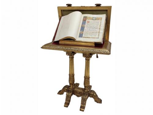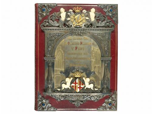 1929. LIBRO. (BIBLIOFILIA-LIBRO FIRMAS). AL ILTRE. SR. D. CLAUDIO PLANAS Y FONT SECRETARO DEL EXCMO. AYUNTAMIENTO DE BARCELONA. Obra homenaje en folio menor. La primera hoja de este libro de firmas está escrita sobre pergamino e iluminada con una bella orla floral y medallones que contienen vistas del ayuntamiento de Barcelona, va firmada por A. Flos. Esta página recoge la dedicatoria que los empleados del ayuntamiento de Barcelona, presididos por el propio alcalde, dirigen al secretario Claudio Planas como homenaje por su trabajo diligente y modélico como servidor público. La entrega de este obsequio tuvo lugar en el salón de la Reina María Cristina de la Casa Consistorial de Barcelona el 17 de mayo de 1929. En el mismo acto el alcalde de la ciudad, D. Darío Romeo, impuso la medalla del Secretariado local al homenajeado. Extraordinario libro de firmas presentado en una encuadernación firmada por Joyas A. Roig en plena piel, hilos dorados, cantos y cejas, cortes dorados y con una composición en plata repujada. El plano anterior presenta decoración en plata formando un frontis arquitectónico que contiene la leyenda "Al Iltre. Sr. D. Claudio...", debajo dos angelotes de marfil sostienen el escudo de Barcelona y en lo alto otros dos angelotes sustentan otra leyenda "Fe Administrativa" en corona de laurel y con corona real. En el plano posterior un medallón de plata lleva grabada la fecha 1929. Refuerzos de plata en las puntas, que en el plano anterior llevan una piedra azul pulida. Las guardas son de seda. La obra va acompañada de una urna expositor de vidrio y madera cerrada con llave, el atril del interior forrado de terciopelo rojo, reposa sobre una peana de dos columnas y seis pies, la madera dorada decorada con volutas.