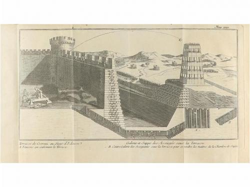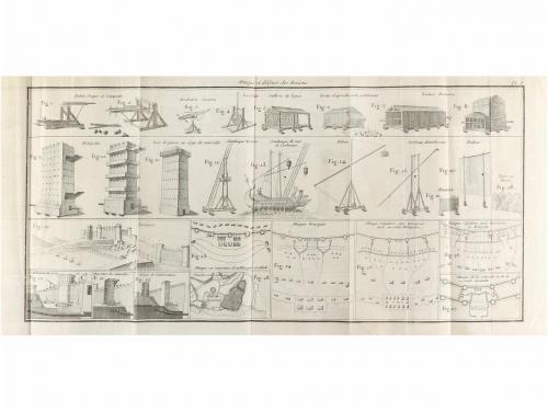 1763. LIBRO. (POLIORCÉTICA). DE MAITRE, MAIN:. PRINCIPES DE L'ART MILITAIRE EXTRAITS DES MEILLEURS OUVRAGES DES AUTEURS MODERNES PAR... Berlin: Haude & Spener, 1763. 8º mayor. 2 h. + 378 p. + 24 lám. plegadas. Portada a dos tintas. Cabeceras, capitales y culs-de-lampe xilografiadas. Enc. en pasta española rozada, lomera cuajada, nervios, tejuelo y cortes jaspeados. CCPB 935861-7.