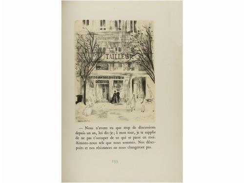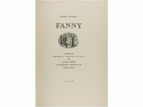 1948. LIBRO. (BIBLIOFILIA). FEYDEAU, ERNEST; GRAU SALA (Ilustr.):. FANNY. Précéde de HISTOIRE ET FORTUNE DE FANNY par JACQUES CREPET. Francia: L'Imprimerie Union, 1948. 4º mayor. XXVII p. + 191 p. + 1 h. Viñeta e ilustraciones dentro de texto, litografías originales de GRAU SALA. Portada ilustrada con grabado xilográfico por A. Marliat. Ejemplar en rama con papel barbado. Rústica con camisa ilustr. presentado en carpeta y petaca en cartoné, algo rozada. Ejemplar numerado del tiraje de 310 ejemplares numerados sobre papel lana.