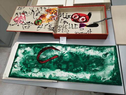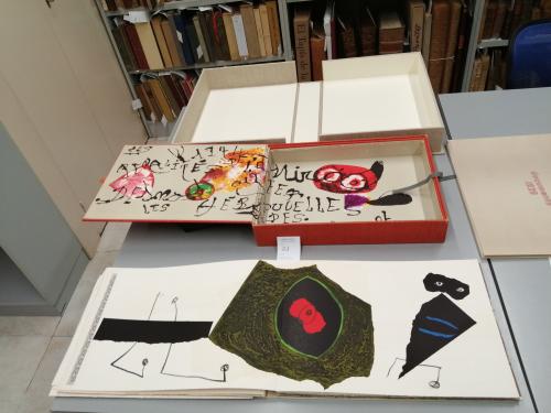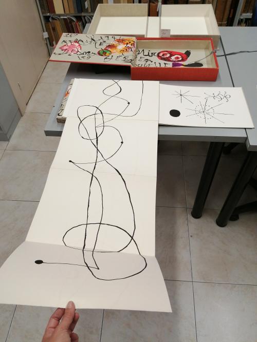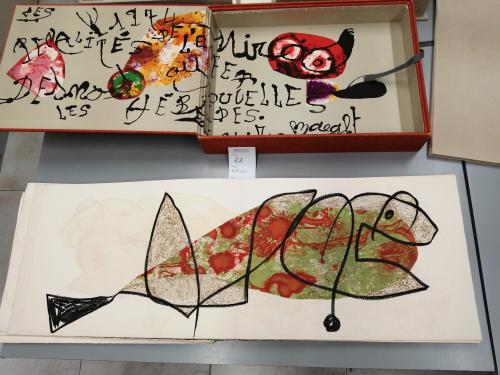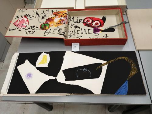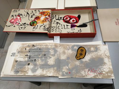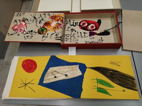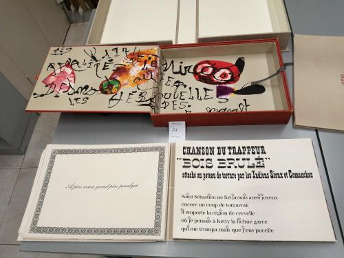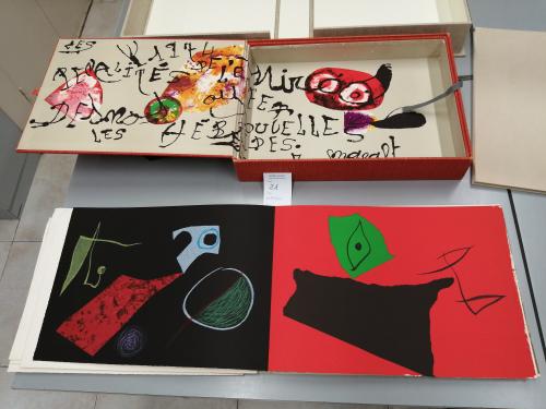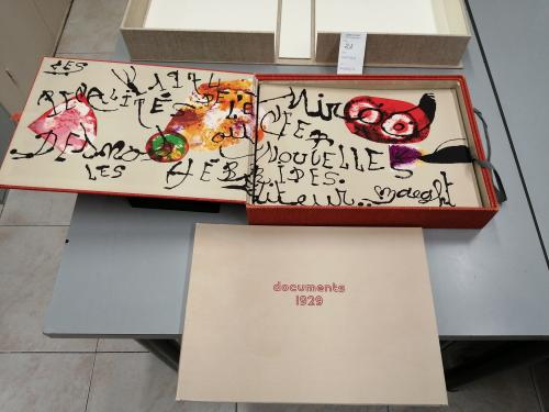 1974. LIBRO. (ARTE-MIRÓ). MIRÓ, JOAN; DESNOS, ROBERT:. LES PÉNALITÉS DE L'ENFER O LES NOUVELLES HÉBRIDES. Paris: Maeght Editeur, 1974. Folio mayor apaisado. Conjunto de 25 litografías 5 de ellas en negro, el resto polícromas, incluídas portada, texto y justificación firmada en naranja por MIRÓ. En rama, presentado en rústica original ilustrada y doble caja, una en arpillera naranja con el interior ilustrado por Miró y otra en arpillera beige. Acompañado de: DOCUMENTS 1929, un conjunto de 6 litografías en negro, una de ellas con adiciones en bolígrafo rojo, presentado en una carpeta en rústica. Interesante colaboración póstuma entre Miró y el célebre escritor surrealista R. DESNOS. Los dos artistas eran ya amigos en los años 20 y 30 e intentaron una colaboración que la Guerra civil española y la Segunda Guerra Mundial truncó. Desnos, militante en la Resistencia francesa, fue detenido por la Gestapo en 1944 y murió poco después de ser liberado. Años más tarde con esta obra se le rindió el merecido homenaje. Ejemplar número 73 del tiraje de 150 de un total de 200.
