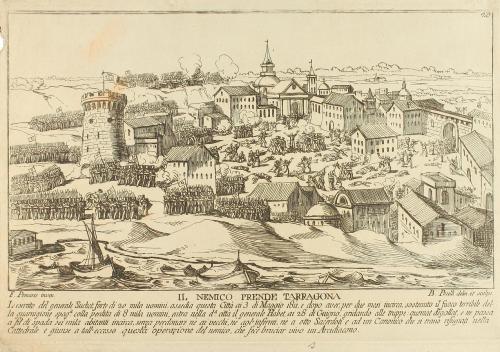 1810 ca. GRABADO. (TARRAGONA). POMARES, F. y PINELLI, B.:. IL ENEMICO PRENDE TARRAGONA. Grabado con leyenda bajo la imagen en italiano. 17 x 25,5 cm huella. [Más:] VISTA MERIDIONAL DE LA CIUDAD DE TARRAGONA. 16 x 20 cm huella, 19 x 30 cm papel.