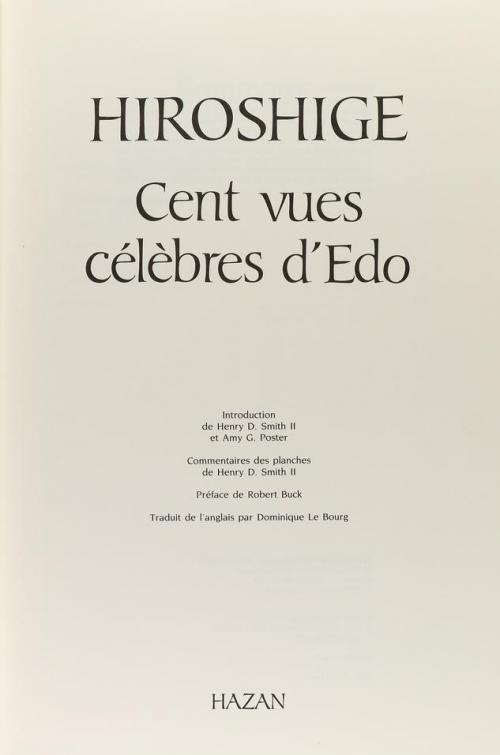 1987. LIBRO. (ARTE JAPONÉS). HIROSHIGE. CENT VUES CÉLÈBRES D'EDO. Paris: Éd. Hazan, 1987. Folio. 256 p. Bellamente ilustrado con 118 lám., cada una de ellas enfrentada con su comentario. Texto en francés a dos columnas. Enc. en tela con sobrecubierta ilustr.