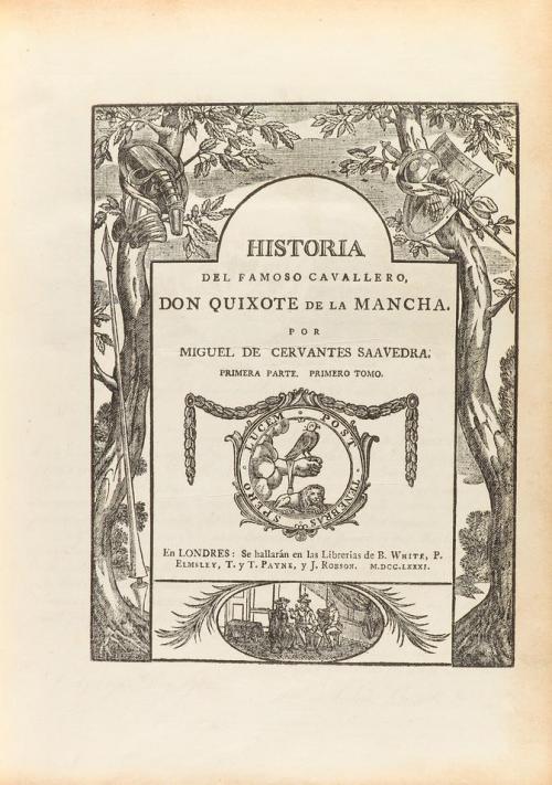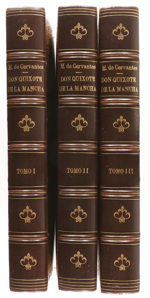 1781. LIBRO. (CERVANTINA). HISTORIA DEL FAMONSO CAVALLERO DON QUIXOTE DE LA MANCHA... ANOTACIONES, ÍNDICES Y VARIAS LECCIONES POR EL REVERENDO JUAN BOWLE. Londres: Librerías de B. White, P. Elmsley, T. y T. Payne, y J. Robson, 1781. Seis tomos en tres vol. en 4º menor. I- Primer y segundo tomo, 2 h. ( portada y dedicatoria en plancha) + XX p.+ 544 p. + 2 h. Con portada propia para el segundo tomo aunque paginación seguida. II- Tercer y cuarto tomo, Salisbury: Imp. Eduardo Easton, 1781. Portada + VIII p.+ 572 p. + 3 h. Portada propia para el cuarto tomo pero paginación seguida. III- Anotaciones e índices, Portada + XXII p. + 157 p. + 167 p. + un mapa plegado + INDICES DE NOMBRES PROPIOS 3 h. + III p. + 114 h. de índices. Seis tomos enc. en tres vol. en plena piel, con hilos dorados en ambos planos y efigie de D. Quijote en orla heráldica en ambos planos, nervios y lomeras con dorados, cortes pintados, firmada por PALOMINO. El encuadernador conservó en las guardas dos antiguos exlibris heráldicos, uno corresponde a Charles James Fox y otro a Roberti-Comitis de Crewe. Alguna marca leve en la piel. Es la segunda edición, del mimo año que la primera, pero aumentada y mejorada, precisamente por ello más apreciada. Palau dice de ella que se publicó a la vista de las ediciones príncipe "el reverendo Bowle lo ilustró con anotaciones y estudios de primera mano, que aún hoy conservan interés. Basta consignar que el trabajo de Bowle ha sido fuente inagotable, donde han bebido todos los comentadores del Quijote, la mayoría callando la procedencia y declarándola únicamente los más sinceros." Es obra muy rara y más completa, el índice de nombres, que es el tomo sexto, no suele aparecer como aquí. Palau 52025 y 52025-II. "La parte tipográfica de esta edición merece todo elogio. Cada portada va encerrada en un marco con trofeos alusivos y escenas del Quijote", Rius 54. Suñé 61.