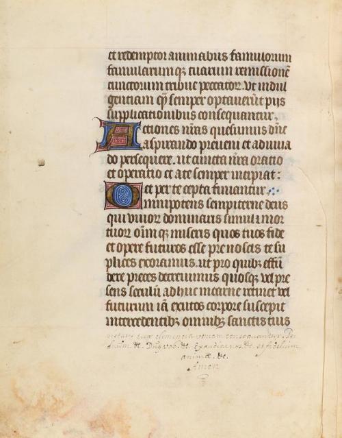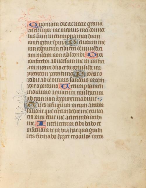 Finales s. XV. MANUSCRITO. FRAGMENTO MANUSCRITO SOBRE PERGAMINO: QUONIAM DIE AC NOCTE GRAVATA EST SUPER ME MANUS TUA CONVERSUS ... Manuscrito. 8º mayor. 14 sin numerar. Pauta en rojo. Manuscritas en letra gótica, capitales decoradas en rojo, dorado y azul. Contiene parte de salmos, letanía a los santos, tras ella fragmentos de salmos y al final en caligrafía algo posterior una pequeña oración. Enc. de antiguo en pergamino a la romana, una h. desprendida. A modo de hoja de guarda una hoja impresa en rojo y negro.