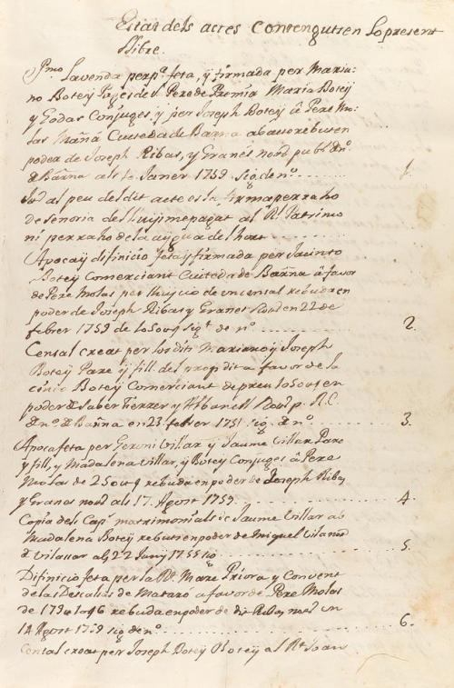 1720-1850. MANUSCRITO. (MARESME). ACTAS DEL MAS BOTEY EN PREMIÀ. Volumen que recoge actas notariales que resumen documentación anterior relacionadas con la casa y masía Botey, también llamada Can Molas, en Sant Pere de Premià, que fue adquirida por Pere Molas en 1759. Todo manuscrito sobre papel y cosido entre sí con cubiertas de pergamino, semidesprendido, y rotulado en el plano anterior.