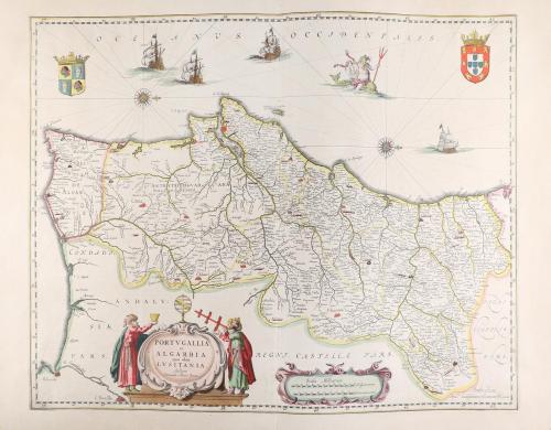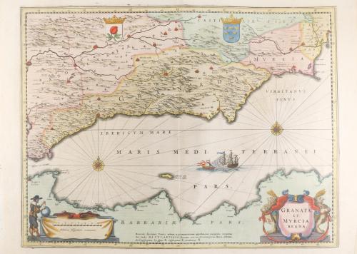 1647 ca. LIBRO. (ATLAS-BLAEU). BLAEU, IOHANNEM:. VOL. FACTICIO DE THEATRUM ORBIS TERRARUM. PARS SECUNDA. Amsterdam: Iohannem Blaeu, 1647 ca. Folio mayor. Sin portada. 31 h. con mapas a doble p. y texto detrás a dos columnas la mayoría en francés, latín e italiano de: España, Cataluña, Valencia, Aragón, Navarra, Vizcaya, Asturias, Galicia, Portugal, Castilla, Andalucía y Granada (repetido, uno con el texto en latín y otro en alemán), un total de 13 mapas. Todos delicadamente coloreados a mano de antiguo. Impreso sobre papel grueso, limpio. Todos los mapas decorados con bellas cartelas sostenidas por angelotes, animales mitólógicos o espléndidas volutas arquitectónicas. Mínimas restauraciones en la parte inferior de la doblez. Enc. firmada por F. Domenech en media piel y tela. Vol. facticio que reconstruye casi totalmente la obra del insigne cartógrafo Iohannem Blaeu que dedicó a la península Ibérica. La obra nace en el momento de esplendor de la cartografía holandesa, por lo que es muy apreciada.