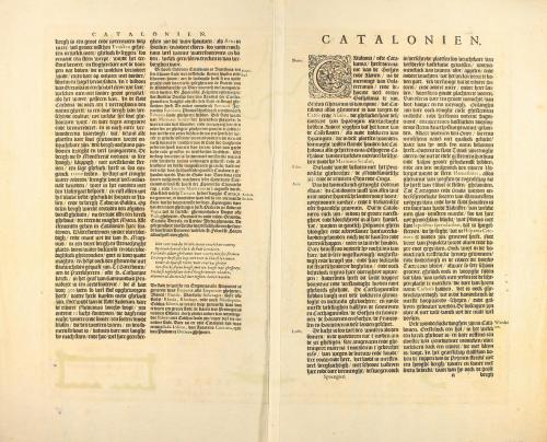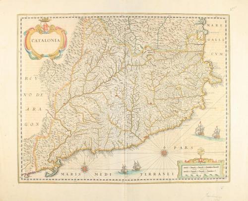 1647 ca. MAPA. (CATALUNYA). [JANSSONIUS:]. CATALONIA. Mapa grabado al cobre, límites y cartelas coloreados. 39 x 48,5 cm huella, 50 x 58,5 cm papel. Texto en letra gótica a dos columnas al dorso, en neerlandés. Publicado en "Atlantis novi pars secunda. Amsterdam: J. Janssonius & Henricus Hondius, [1647]".