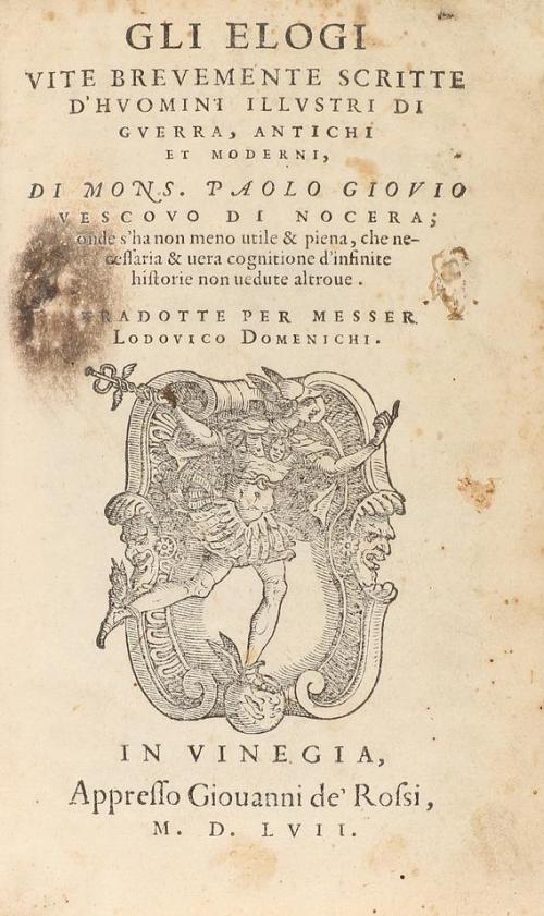 1557. LIBRO. (MILITARIA). GIOVIO, PAOLO:. GLI ELOGI VITE BREVEMENTE SCRITTE D´HUOMINI ILLUSTRI DI GUERRA, antichi et moderni... Venezia: Rossi, 1557. 8º. 16 p. + 351 p. Capitales y cul-de-lamp. Enc. en pergamino rígido, cortes pintados, tejuelo.