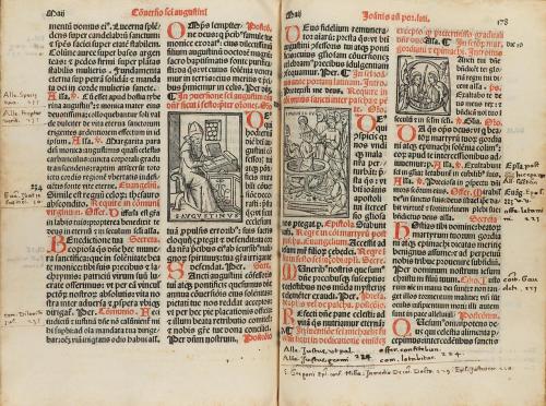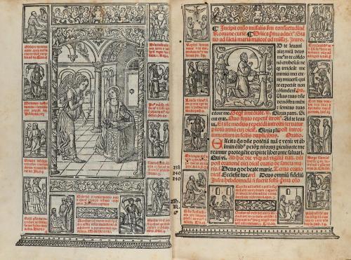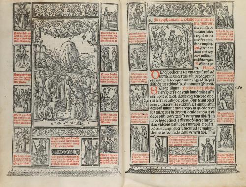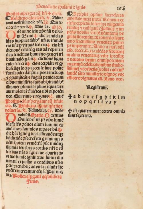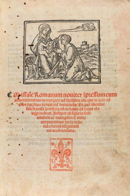 15(19). LIBRO. (GÓTICO-MISAL). MISSALE ROMANUM NOVITER IMPRESSUM CUM ANNOTATIONIBUS IN MARGINE AD FACILLISIME OIA QUE IN IPSO AD ALIAS PAGINAS REMITTUNT IVENIENDA... Venetia: Imprensis viri Lucca[n]onii de Giu[n]ta, anno 15(19?) escrito m ccccc ix xi. 4º menor. 8 h. + 264 fol. + 11 fol. manuscritos numerados siguiendo la foliación de la obra impresa; la tinta ferruginosa de estas hojas manuscritas ha oscurecido, y puntualmente quemado, el papel. Texto a dos columnas en letra gótica y a dos tintas. Abundantes capitales y viñetas xilografiadas y decorado con escenas del antiguo y nuevo testamento además de los primeros mártires, a doble página xilografíadas y texto en rojo. Contiene fragmentos musicales sobre tetragrama, en rojo, y notación pneumática. Anotaciones marginales de época, de la misma mano que los últimos folios manuscritos. Enc. en piel gofrada de época, restaurada, nervios, ha perdido los cierres. Algún fino taladro en el plano anterior traspasa las primeras hojas. Bonita edición muy ilustrada de la imprenta de Giunta.