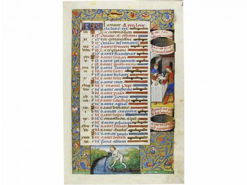 1995. LIBRO. (FACSÍMIL). LIBRO DE HORAS DE CARLOS VIII REY DE FRANCIA. Barcelona: Ed. Moleiro, 1995. 4º. 112 fol. iluminados. Enc. piel con dorados en ambos planos, nervios, lomera cuajada, algo descolorida, cortes dorados y cierres metálicos. Presentado en un estuche de terciopelo. Edición numerada limitada a 987 ejemplares con acta notarial. Jacques de Besançon es el autor de las miniaturas de este libro de horas con más de 200 decoraciones vegetales en los márgenes y 190 escenas con motivos del antiguo y nuevo testamento, de la vida de la Virgen y, ocasionalmente, escenas militares. Acompañado del libro de estudio de la mano de Ana Domínguez Rodríguez, algo rozado.