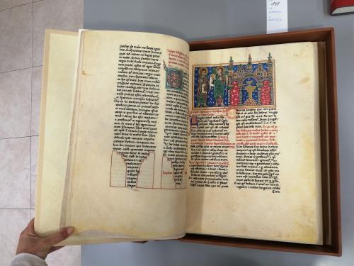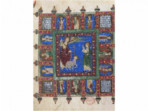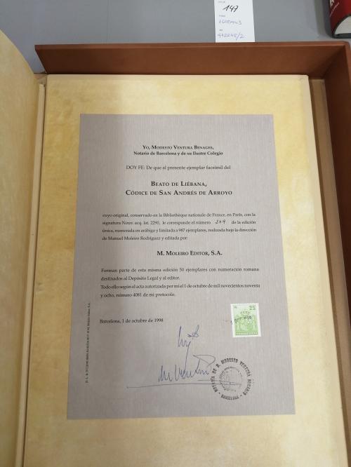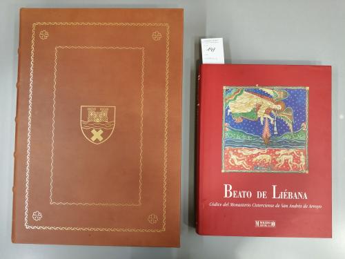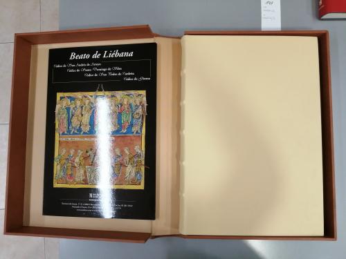 1998. LIBRO. (FACSÍMIL). EL BEATO DE LIÉBANA. CÓDICE DEL MONASTERIO CISTERCIENSE DE SAN ANDRES DE ARROYO. Barcelona: Ed. Moleiro, 1998. Folio imperial. Aprox. 166 fol. iluminados. Enc. plena piel, nervios. Presentado en un estuche del mismo material con ruedas en los planos. Escrito en letra gótica carolíngia entre 1219 y 1235 para Fernando III el Santo, único ejemplo en combinación de elementos arcaicos y tardíos del medievo. Las similitudes estilísticas con el Beatus de Cardeña nos hacen pensar que quizás fue ilustrado en el Monasterio de San Pedro de Cardeña. Incluye libro de estudio en folio mayor; 385 p. A cargo de Vivancos, Ocón, Verdis y Miranda. Enc. tela con sobrecubierta. Edición numerada y limitada a 987 ejemplares, con acta notarial.