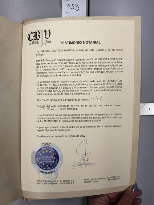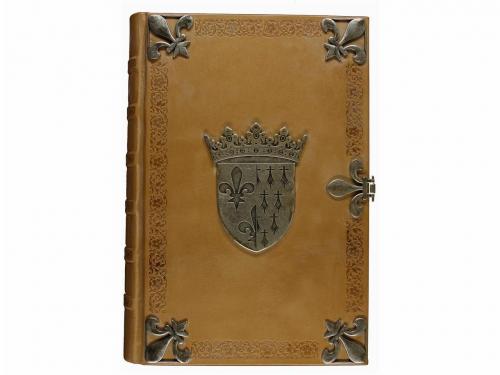 2003. LIBRO. (FACSÍMIL). LIBRO DE HORAS DE ANA DE BRETAÑA. Albacete: Ed. Versol, 2003. Folio. 477 p. imitando pergamino con reproducción facsími con abundantes ilustraciones y dorados. El original se encuentra custodiado en la Bibliotheque Nationale de Paris. Enc. plena piel con aplicaciones y escudo metálico. Cortes dorados, presentado en un estuche en terciopelo. Edición numerada y limitada a 600 ejemplares con acta notarial. Acompañado del libro de estudio.