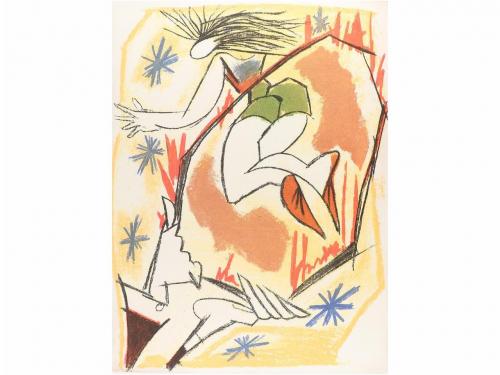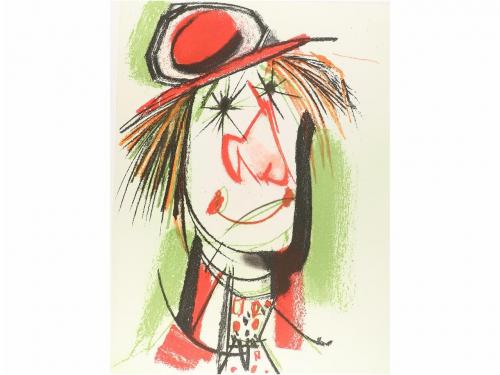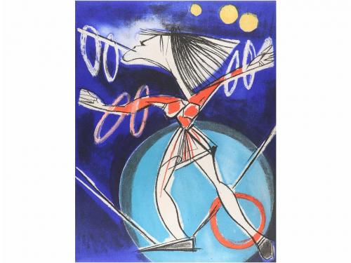 2003. LIBRO. (ARTE-BIBLIOFILIA). GÓMEZ DE LA SERNA, RAMÓN; DELGADO, ÁLVARO:. EL CIRCO. Madrid: Hispánica de Bibliofilia, 2003. Gran folio. XIV pliegos numerados, cada uno de ellos con un grabado, uno de ellos doble, firmados y numerados a lápiz por Álvaro Delgado. Portada y frontis cromolitográfico. Presentado en una caja en tela editorial ilustrada con algún pequeño cerco de humedad y mínima rasgadura en la tela, carpeta y en rama. Tiraje de 175 ejemplares.