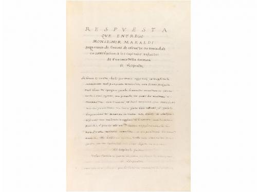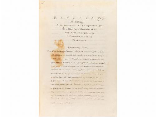 1633 ca. MANUSCRITO. (HISTORIA). MEMORIAL DE SU MAGESTAD QUE DIERON A NUESTRO MUY SACRO PADRE URBANO PAPA VIII. Manuscrito en 4º mayor, sobre papel y enc. en pergamino. El texto está redactado por dos manos diferentes y recoge tres documentos relacionados, el primero, el descrito en título, el segundo RESPUESTA QUE ENTREGO MONSEGNOR MARALDO... en ITALIANO ÚNICAMENTE y por último REPLICA QUE SE ENTREGÓ A SU SANTIDAD À LA RESPUESTA QUE DE ORDEN SUYO DIERON LOS MINISTROS SOBRE LOS CAPITULOS DE REFORMACION, Y ABUSOS DE LA CURIA. Todo de la misma mano hasta la primera hoja del tercer documento, donde la caligrafía cambia. Manuscrito sobre buen papel, con amplios márgenes, comprende 24 h. con el texto del memorial + 6 h. con las Respuesta + 71 h. con la Réplica. Presenta cercos de humedad antiguos en la parte inferior de los primeros pliegos y alguna restauración, en la esquina de las dos primeras hojas y las dos últimas, sin pérdida de texto. Muchos estudiosos consideraron este texto el máximo exponenete del reagalismo en España, aunque Menéndez Pelayo siempre sostuvo que el reagalismo llegó a España con Felipe V y el inicio de la monarquía Borbónica. Sin embargo ya en época de Felipe IV, y este escrito lo documenta, las reivindicaciones de la corona ante el papado son más antiguas. Este manuscrito está limpio y sin tachaduras, lo que nos hace pensar en una copia para un archivo oficial o eclesiástico, la caligrafía nos sitúa en la época en que fue escrito, y aunque el texto fue impreso es posible que esta copia sea anterior a su impresión.