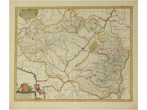 1640 ca. MAPA. (ARAGÓN). LABANNA, IOANNE BAPTISTA:. NOVISSIMA ARRAGONIAE. REGNI TABULA. Mapa calcográfico sobre papel verjurado. Papel: 52,5 x 61 cm; huella: 45 x 55 cm. Límites y cartelas iluminados de época. Señal de doblez central.