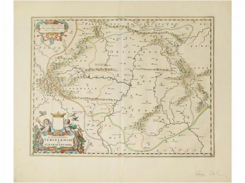 1665. MAPA. (ARAGÓN-TERUEL). LABANNA, JOANNE BAPTISTA; BLAEU:. EPISCOPATUS TERUELENSIS ET ALBARACINESIS. Mapa calcográfico sobre papel verjurado. Papel: 51 x 60 cm; huella: 39 x 55 cm. Límites y cartela finamente iluminados de época. Texto en latín al dorso. Señal de doblez central reforzada.
