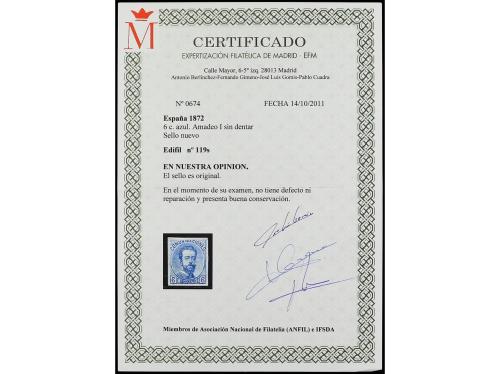 * ESPAÑA. Ed. 119s. 6 cts. azul. SIN DENTAR. RARÍSIMO, pocos * ESPAÑA. Ed. 119s. 6 cts. azul. SIN DENTAR. RARÍSIMO, pocos