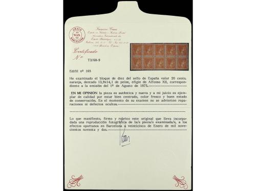 **/* ESPAÑA. Ed. 165. 20 cts. naranja. Bloque de cuatro, centraje normal de la emisión. MUY RARO. Cert. GRAUS del bloque de diez de donde proviene. Cat. 2.450€.