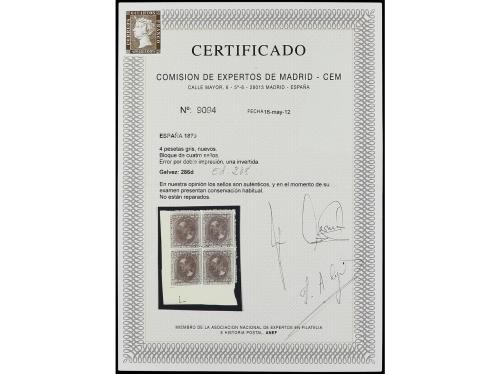 * ESPAÑA. Ed. 208. 4 pts. gris. Bloque de cuatro DOBLE IMPRESIÓN, UNA INVERTIDA. Se trata probablemente de un ensayo. No catalogado. Cert. CEM.