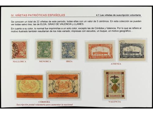 */° ESPAÑA. 1898. GUERRA DE CUBA. Viñetas de SUBSCRIPCIÓN NACIONAL. Conjunto de 23 viñetas (19 diferentes) de 5 cts. de distintas poblaciones españolas en nuevo y usado, algunas de ellas muy raras, se adjunta fotocopia de la Gaceta de Madrid del 15 de abril de 1898 autorizando la creación de estos sellos. Raro conjunto (ver web).