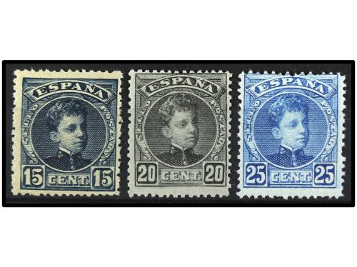 ** ESPAÑA. Ed. 244, 247, 248. 15 cts. azul negro, 20 cts. negro y 25 cts. azul, aceptables centrajes, raros sin fijasellos. Cat. 165€.