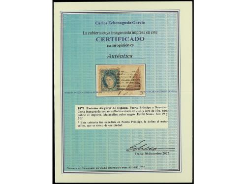 CUBA. Ant. 19, 20. 1870. PUERTO PRINCIPE a NUEVITAS. 10 cts. verde y 20 cts. castaño bisectado para completar la tarifa de 20 cts. Rarísima combinación de franqueo, probablemente única conocida. Cert. ECHENAGUSIA.