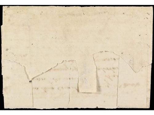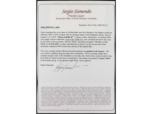 FILIPINAS. Ed. 7 (2). 1859. MANILA a SAN MIGUEL. 5 cuartos bermellón, mat. círculo de puntos y fechador MANILA/IS. FILIP. en azul, sobre con roturas y de papel frágil. Raro franqueo. Cert. SISMONDO.
