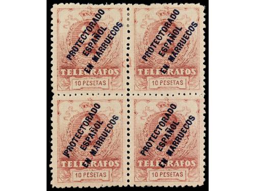* MARRUECOS. Ed. 1/8 (4). TELÉGRAFOS. Serie completa. 8 valores en bloques de cuatro. 4 pts. sin dentar entre los sellos de la pareja superior y sin goma. 10 pts. falta un diente. RARO en bloque. Cat. +2.242€.
